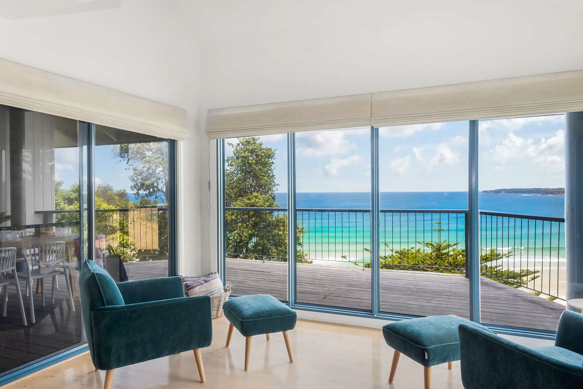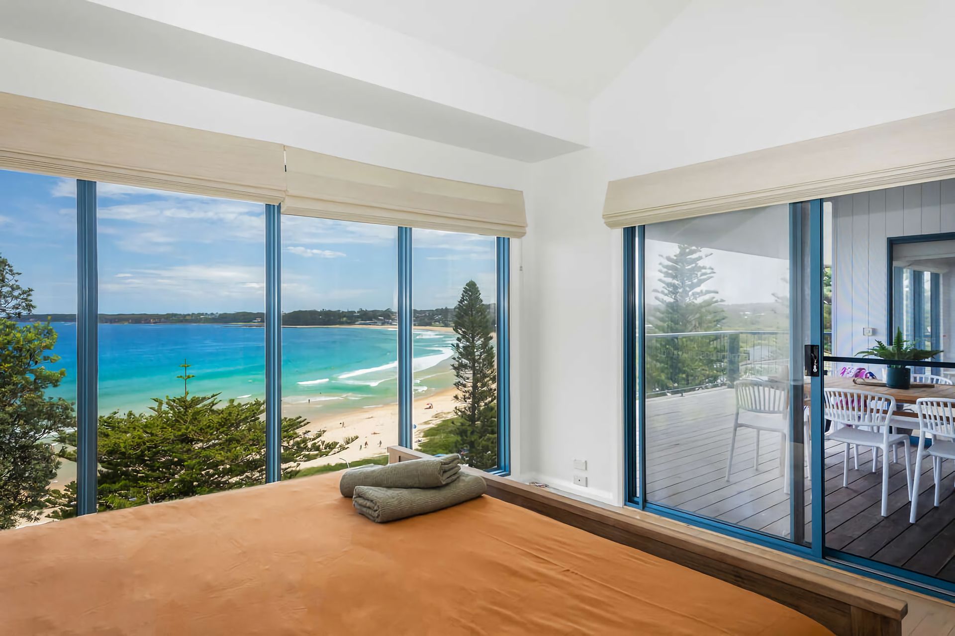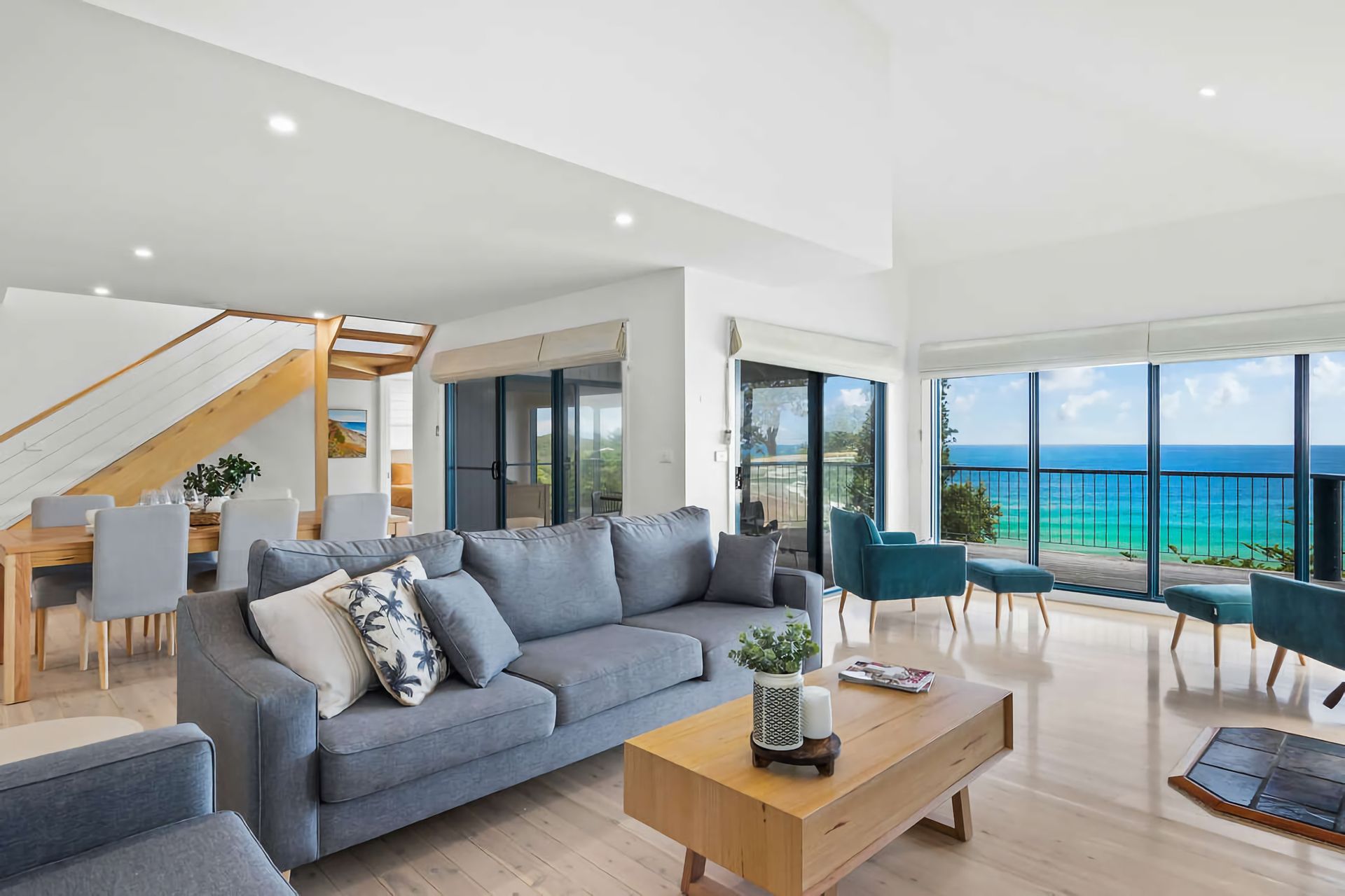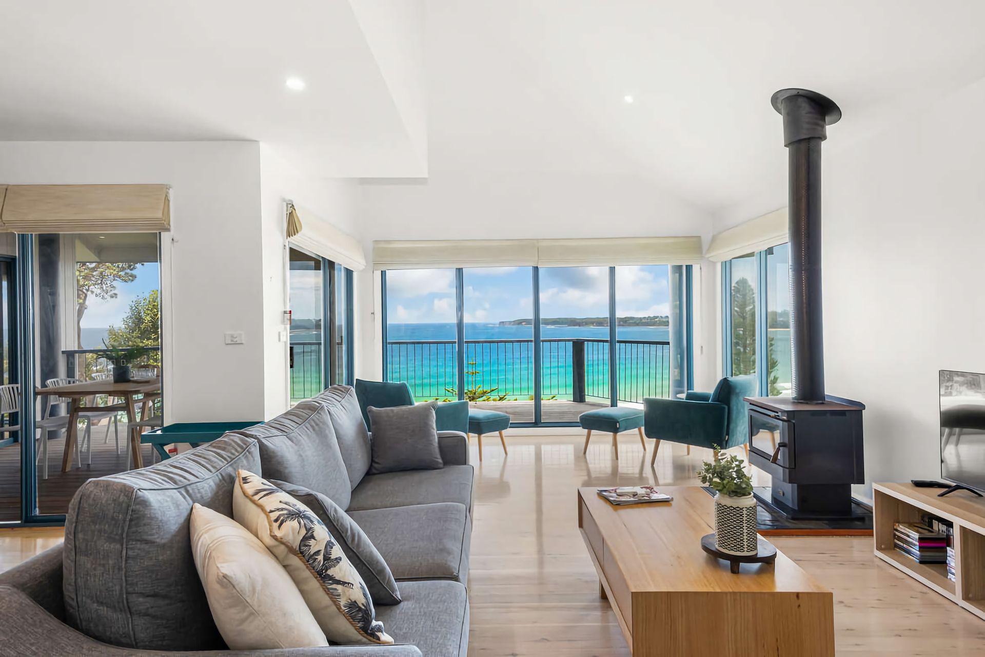 From the forecourt, enter the oversized open-plan living area, which includes a spacious dining and lounge area oriented to maximize the stunning views. The living space opens onto a large deck with outdoor dining overlooking the water. Relax on the generous couches while enjoying all-weather views, or watch your favorite shows on the smart TV with Blu-ray and DVD player.