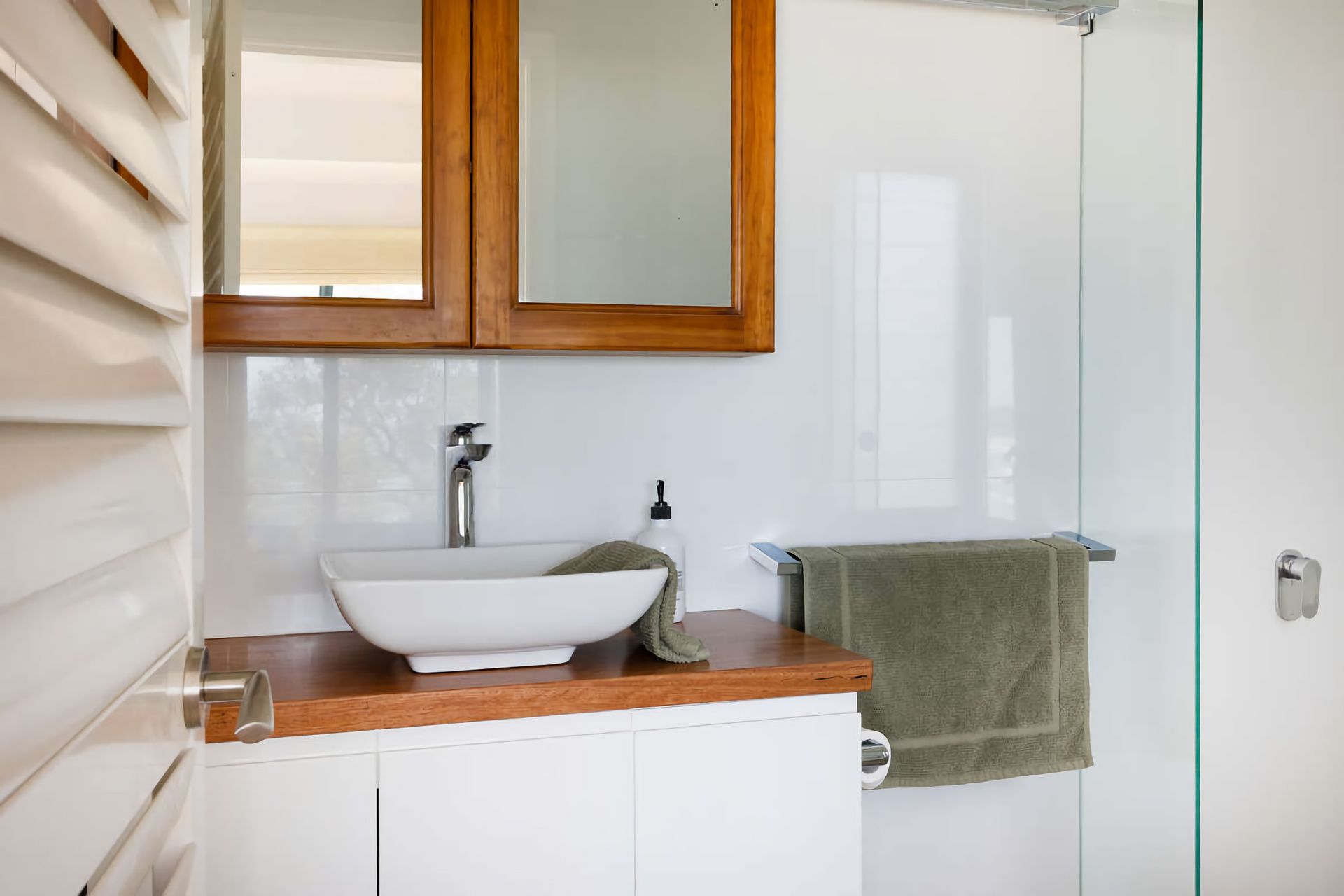 Wake up to stunning glass-wall views from the bed in the primary bedroom, which also features an en suite bathroom with a shower and walk-in wardrobe. The second main-level bedroom offers a wall of built-in wardrobes.